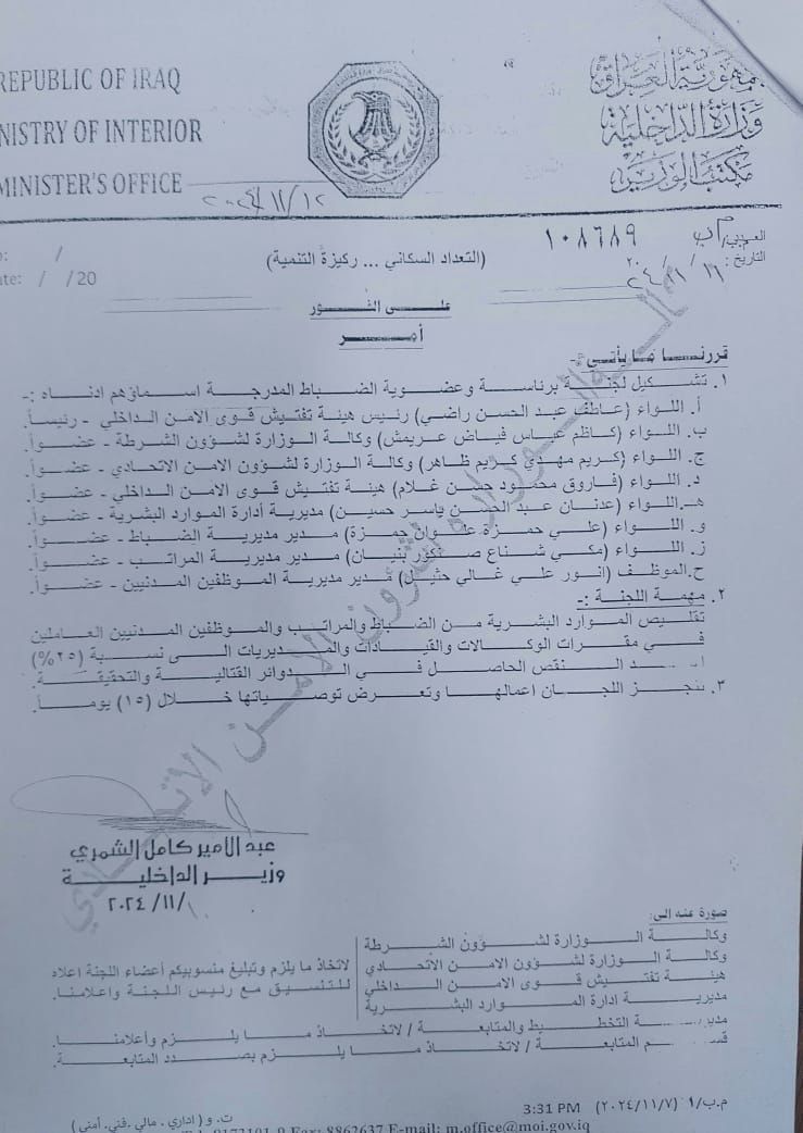 وجاء في وثيقة صادرة عن مكتب الوزير، أن “الشمري وجه بتشكيل لجنة برئاسة وعضوية 7 ضباط برتبة لواء مهمتها تقليص الموارد البشرية من الضباط والمراتب والموظفين المدنيين العاملين في مقرات الوكالات والقيادات والمديريات بنسبة 25% لسد النقص الحاصل في الدوائر القتالية والتحقيقية”.