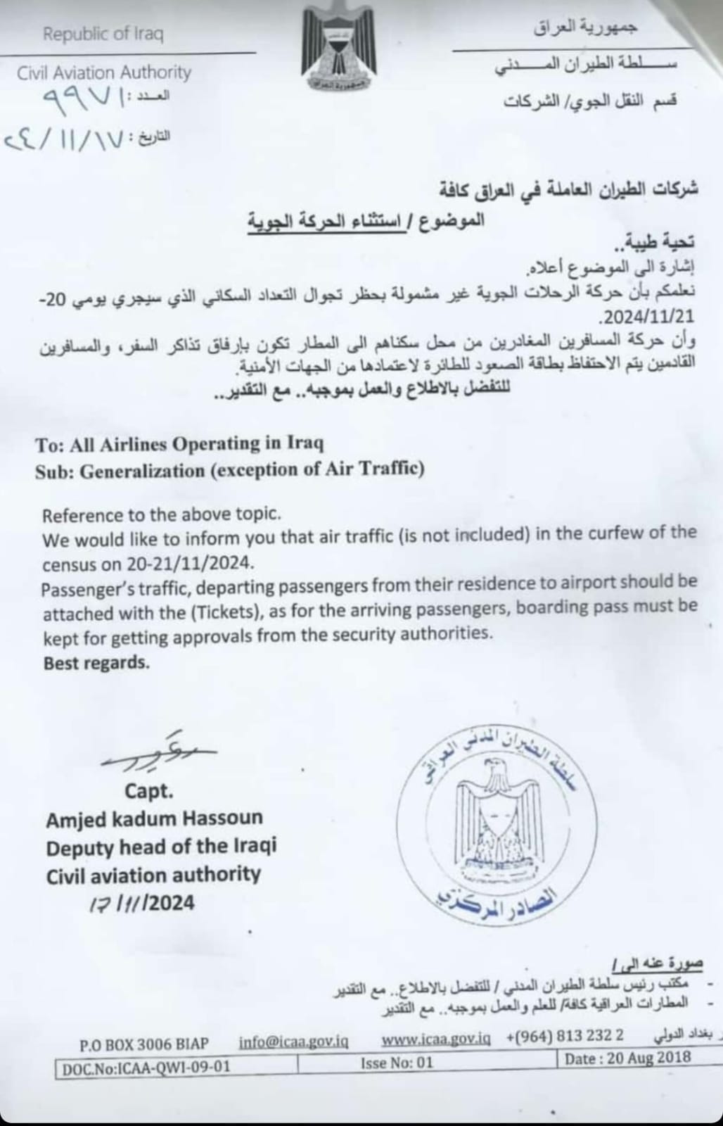 أبلغت سلطة الطيران المدني، اليوم الأحد، شركات الطيران العاملة في العراق، باستثناء الرحلات الجوية من حظر التجوال يومي التعداد السكاني، للرحلات المغادرة والقادمة إلى العراق.