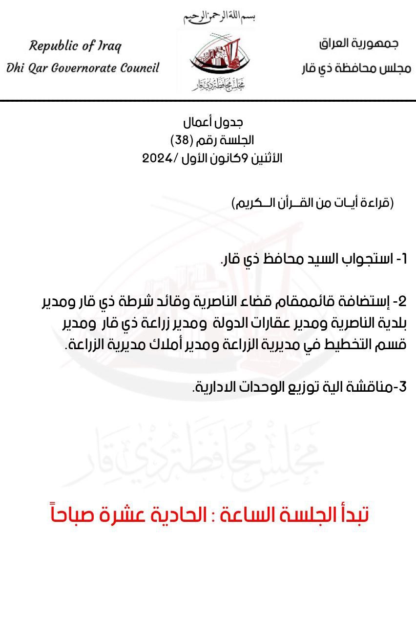 مجلس ذي قار يعقد اجتماعه غدا ويستجوب المحافظ ويستضيف قائممقام الناصرية وقائد الشرطة