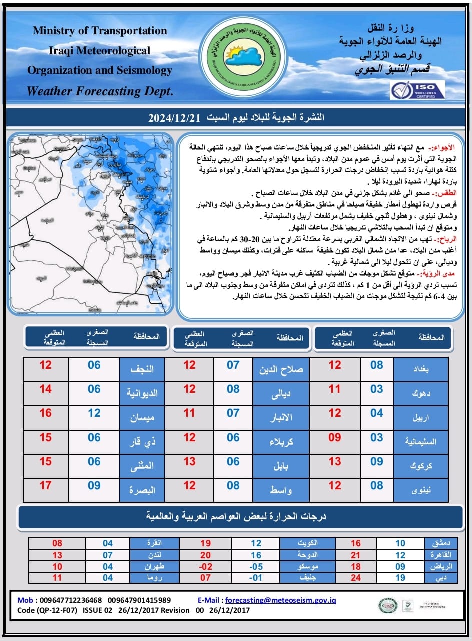 أعلنت الهيئة العامة للأنواء الجوية العراقية، صباح اليوم السبت، انتهاء تأثير المنخفض الجوي الذي أثّر يوم أمس على معظم مدن البلاد، حيث تبدأ الأجواء بالاستقرار التدريجي مع اندفاع كتلة هوائية باردة تُسبب انخفاضاً في درجات الحرارة لتسجل حول معدلاتها العامة، مما يؤدي إلى أجواء شتوية باردة نهاراً وشديدة البرودة ليلاً.