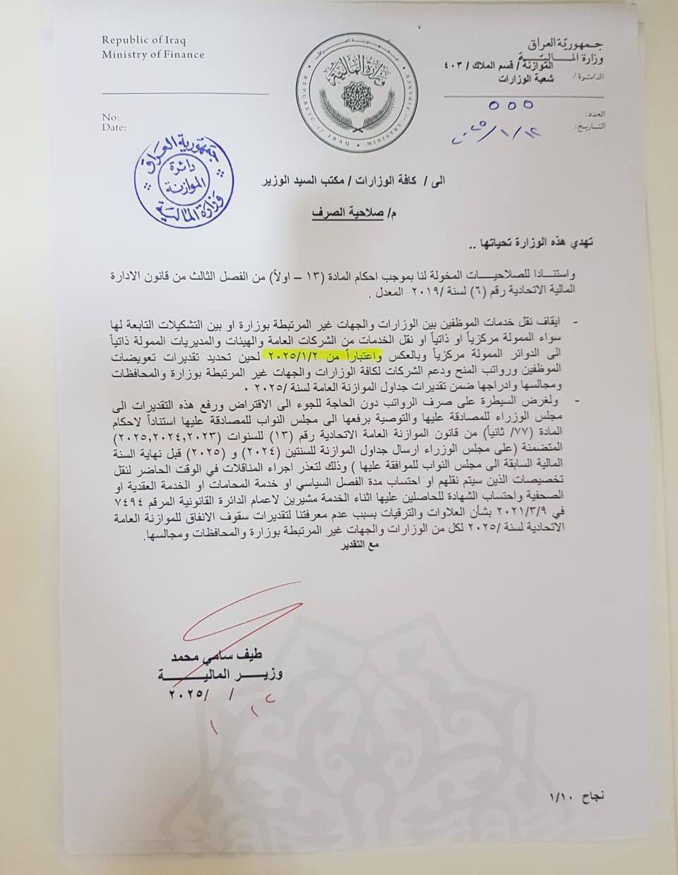قررت وزارة المالية، اليوم الأحد، ايقاف نقل خدمات الموظفين بين الوزارات والجهات غير المرتبطة بالوزارات بسبب عدم معرفة سقف الانفاق المالي للسنة الحالية.