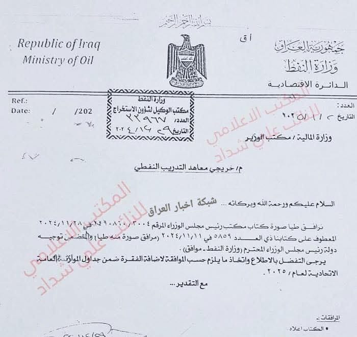 وأكدت الوزارة، في وثيقة، انه حسب موافقة رئيس مجلس الوزراء على وزارة المالية اتخاذ ما يلزم لاضافة فقرة تعيين خريجي معاهد التدريب النفطي ضمن جداول الموازنة العامة الاتحادية لعام 2025.