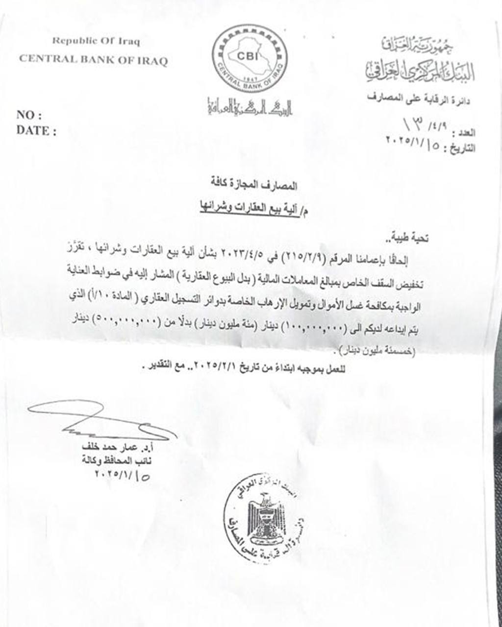 وقرر البنك المركزي بحسب وثيقة له، تلقتها صحيفة الناصرية الالكترونية، “خفض السقف الخاص بمبالغ المعاملات المالية {بدل البيوع العقارية} ليتم إيداع 100 مليون دينار بدلاً من 500 مليون دينار”.