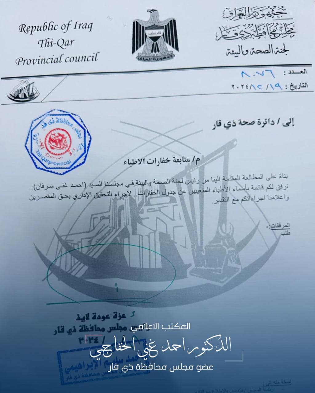 وقال الخفاجي في كتاب رسمي نشره على صفحته الشخصية الفيس بوك تابعه، صحيفة الناصرية الإلكترونية، انه “يرفق قائمة بأسماء الأطباء المتغيبين عن جدول الخفارات في كتاب رسمي معنون الى دائرة الصحة لأجراء التحقيق الإداري بحق المقصرين”.