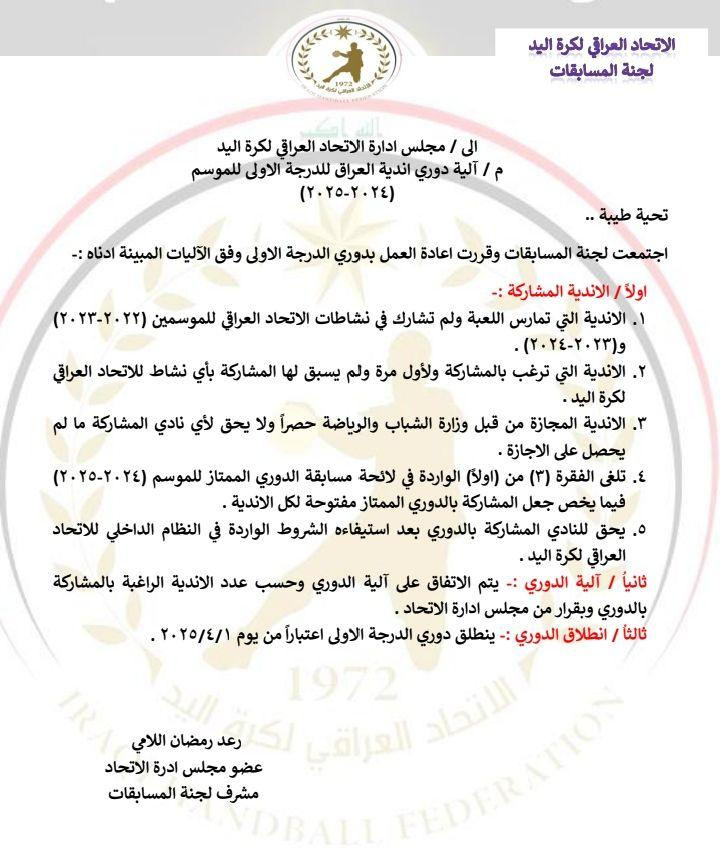 وبين بأنه “قد تم إلغاء الفقرة ( 3 ) من ( اولا) الواردة في لائحة مسابقة الدوري الممتاز للموسم (2024-2025 ) فيما يخص جعل المشاركة بالدوري الممتاز مفتوحا لكل الأندية كما ان للنادي حق المشاركة في دوري الدرجة الأولى بعد استيفاءه الشروط الواردة في النظام الداخلي للاتحاد العراقي لكرة اليد “.