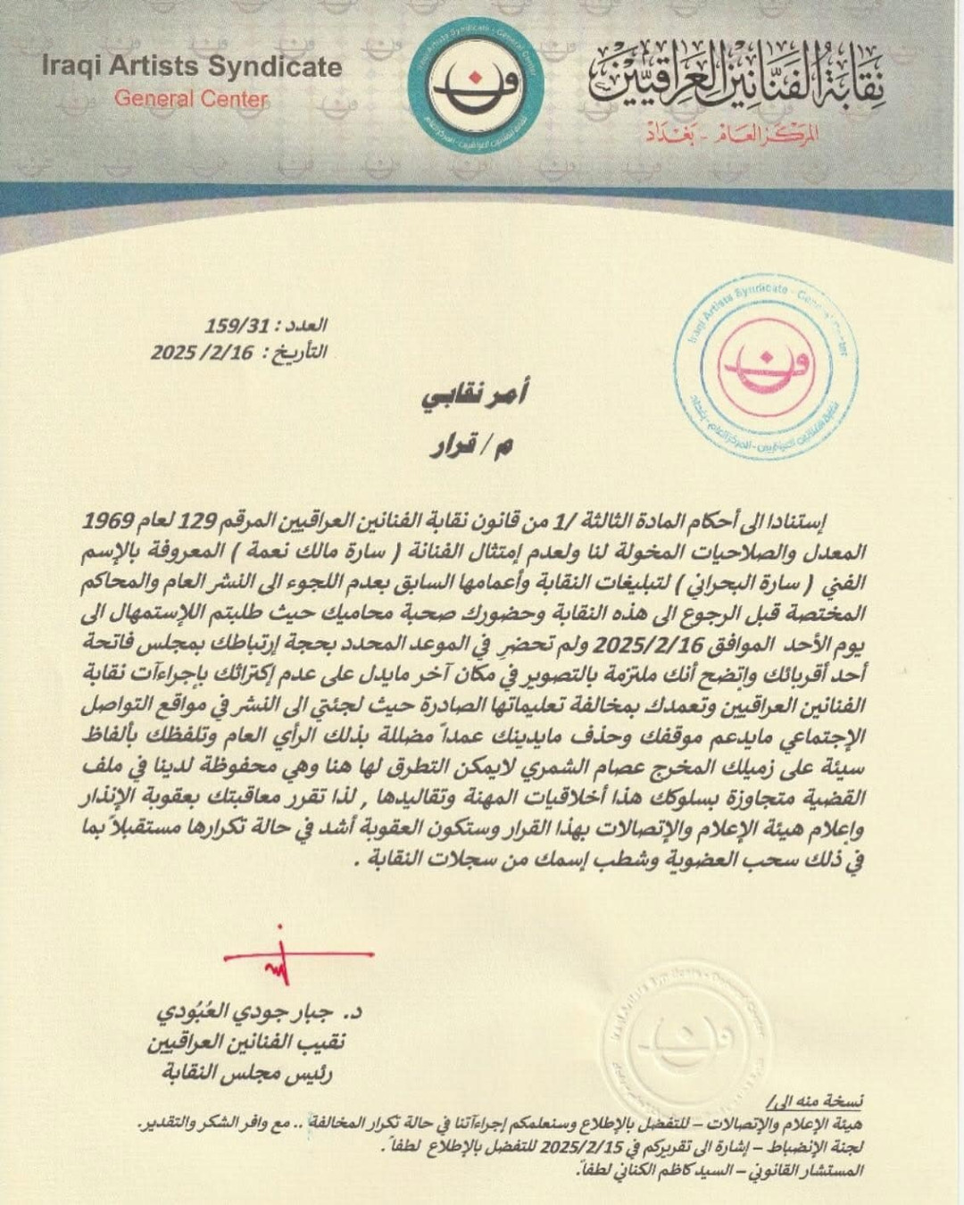 أصدرت نقابة الفنانين العراقيين، اليوم الأحد، عقوبة الإنذار للفنانة (سارة مالك نعمة) المعروفة بـ(سارة البحراني) لـ”تعمدها مخالفة تعليمات النقابة متجاوزة بسلوكها أخلاقيات المهنة وتقاليدها”.