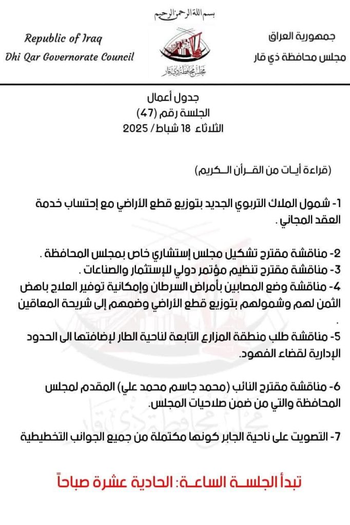 أخبار الناصرية مجلس ذي قار ينشر جدول أعمال جلسة يوم غد الثلاثاء في 17/02/2025 صحيفة الناصرية الإلكترونية: يناقش مجلس ذي قار في جدول أعماله عدد من المقررات ضمن جلسته الاعتيادية المقرر عقدها يوم غد الثلاثاء. شارك هذا الموضوع: النقر للمشاركة على X (فتح في نافذة جديدة) X انقر للمشاركة على فيسبوك (فتح في نافذة جديدة) فيس بوك مرتبط أكمل القراءة