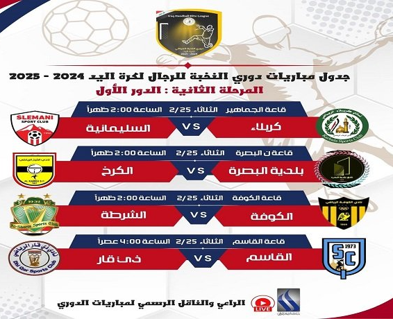تفتتح اليوم الثلاثاء، منافسات الدور الأول من المرحلة الثانية لدوري نخبة كرة اليد، بإقامة أربع مباريات، إذ يحل وصيف الترتيب الحالي فريق الكرخ، ضيفاً على صاحب المركز الرابع عشر بلدية البصرة في محافظة البصرة بينما يلاقي الكوفة في ملعبه نظيره النجف.