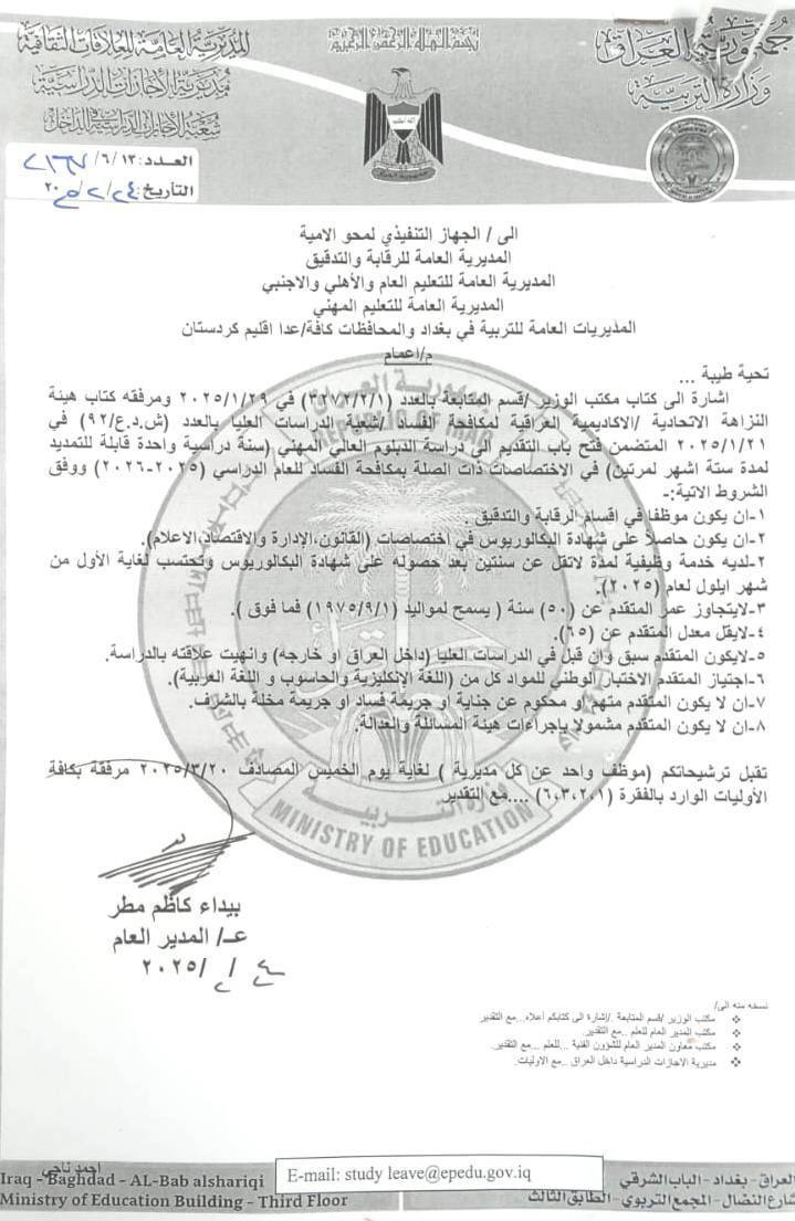 وحددت التربية شروطاً للتقديم وعلى وفق المدرجة في الكتاب أدناه: