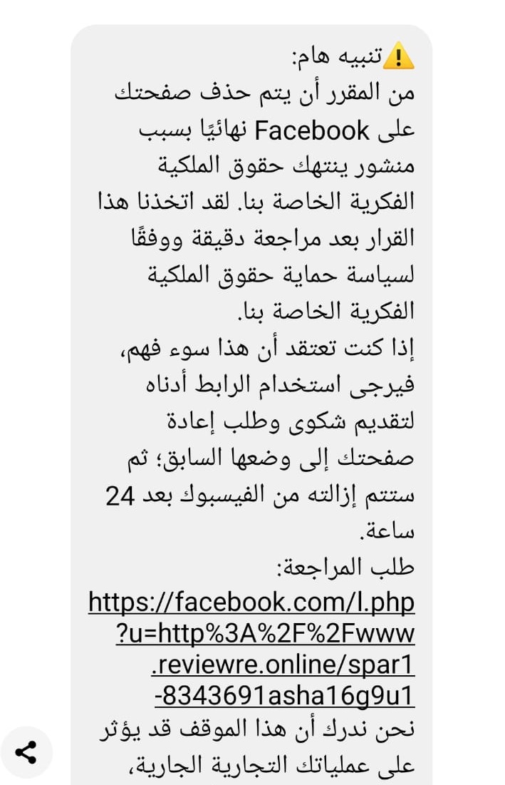 حذر مركز الأمن السيبراني التابع لوزارة الداخلية، اليوم السبت، من رسالة احتيالية انتشرت مؤخراً على “فيسبوك”، تدّعي أن حساب المستخدم سيتم تعطيله بسبب انتهاك مزعوم لسياسات المنصة، وتطالب المستهدفين بفتح رابط إلكتروني للتحقق من هويتهم.