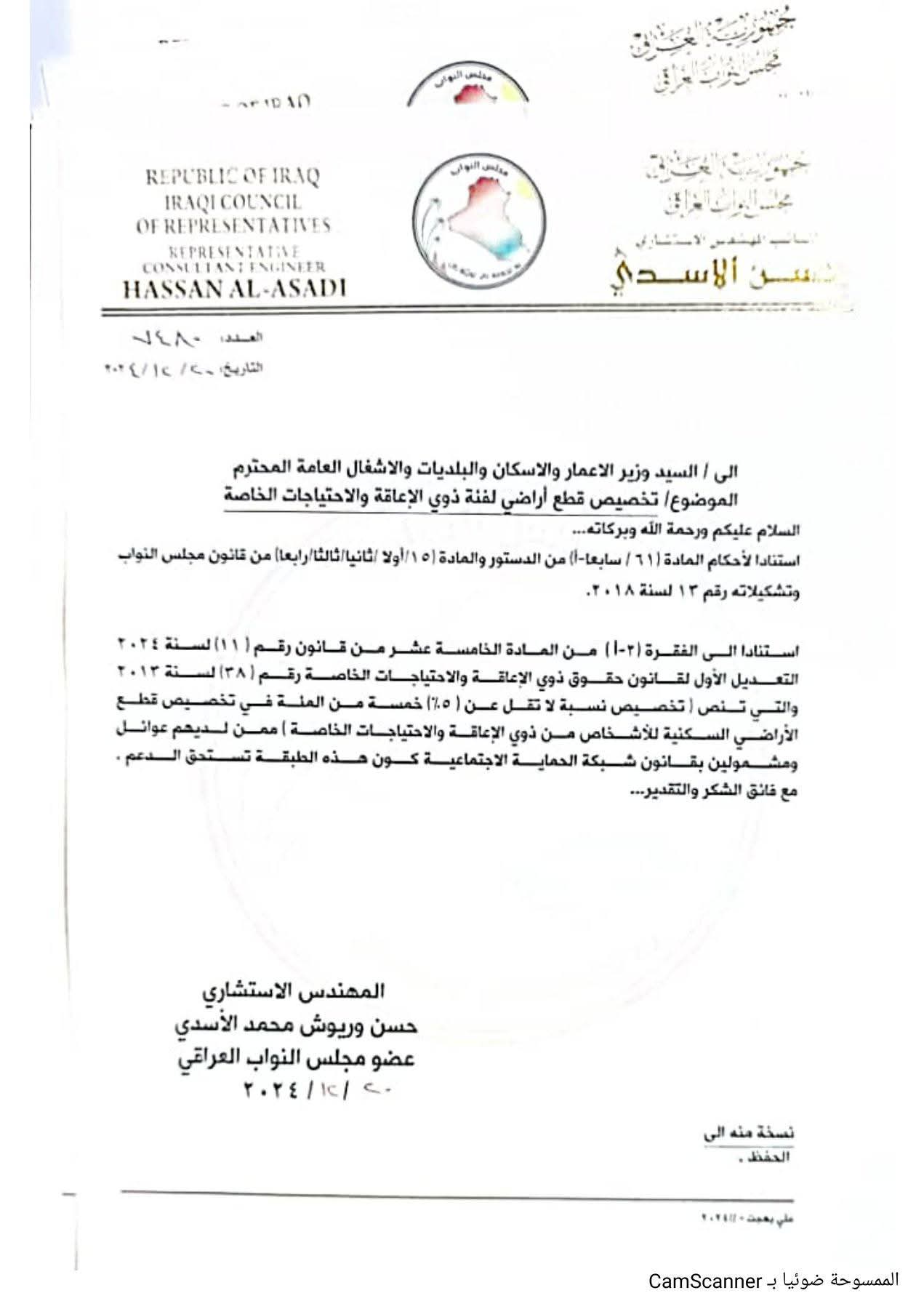 أكد النائب عن محافظة ذي قار حسن الاسدي اليوم الأحد. عن استحصال موافقة وزير الإعمار والإسكان على توزيع قطع الأراضي لذوي الإعاقة والإحتياجات الخاصة.