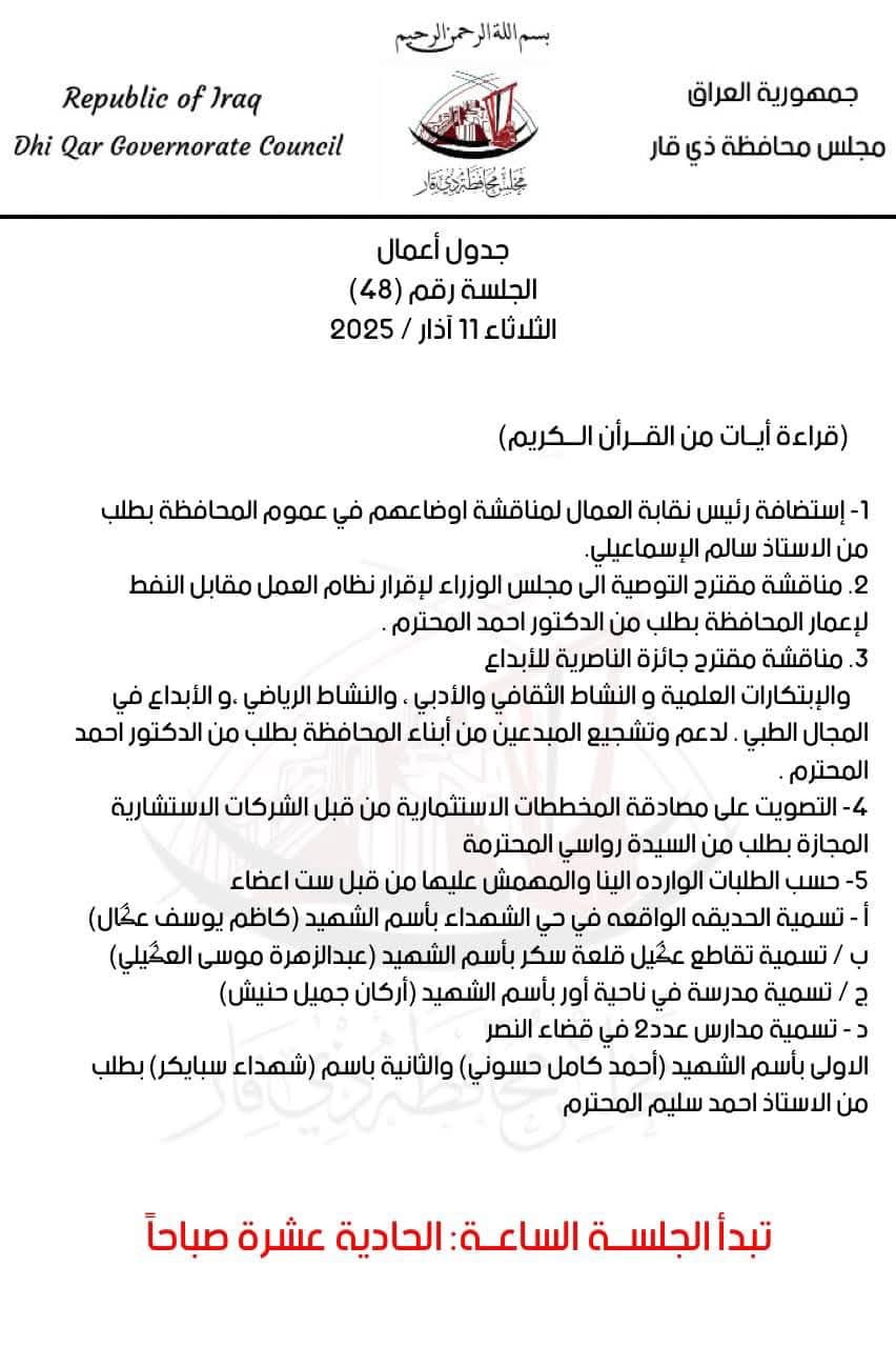 يعقد مجلس محافظة ذي قار، اليوم الثلاثاء، جلسته الاعتيادية الثامنة والاربعون لمناقشة عدد من المقررات المدرجة على جدول الأعمال من ضمنها استضافة رئيس نقابة العمال في المحافظة لمناقشة أوضاع العمال.