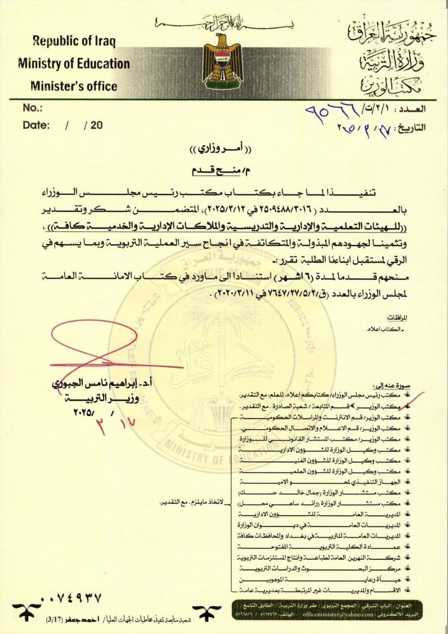 اخبار العراق التربية تصدر أمراً وزارياً بمنح قدم (6) أشهر للهيئات التعليمية والإدارية والتدريسية في 17/03/2025 صحيفة الناصرية الالكترونية: أصدرت وزارة التربية، أمراً وزارياً بمنح قدم 6 أشهر للهيئات التعليمية والإدارية والتدريسية والملاكات الإدارية والخدمية. شارك هذا الموضوع: النقر للمشاركة على X (فتح في نافذة جديدة) X انقر للمشاركة على فيسبوك (فتح في نافذة جديدة) فيس بوك مرتبط أكمل القراءة