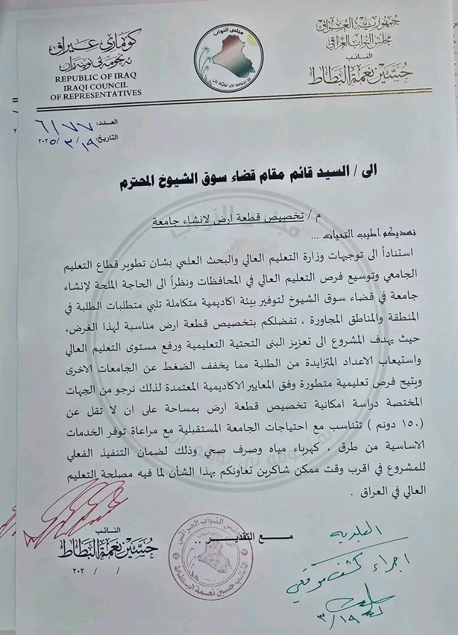 وقال النائب حسين البطاط، أنه “أشرف مع الحكومة المحلية على تخصيص مساحة من الارض لانشاء جامعة سوق الشيوخ وبحضور القائممقام وعميد كلية التربية الاساسية ومدير البلدية حيث ستكون حسب المواصفات المطلوبة من وزارة التعليم العالي.