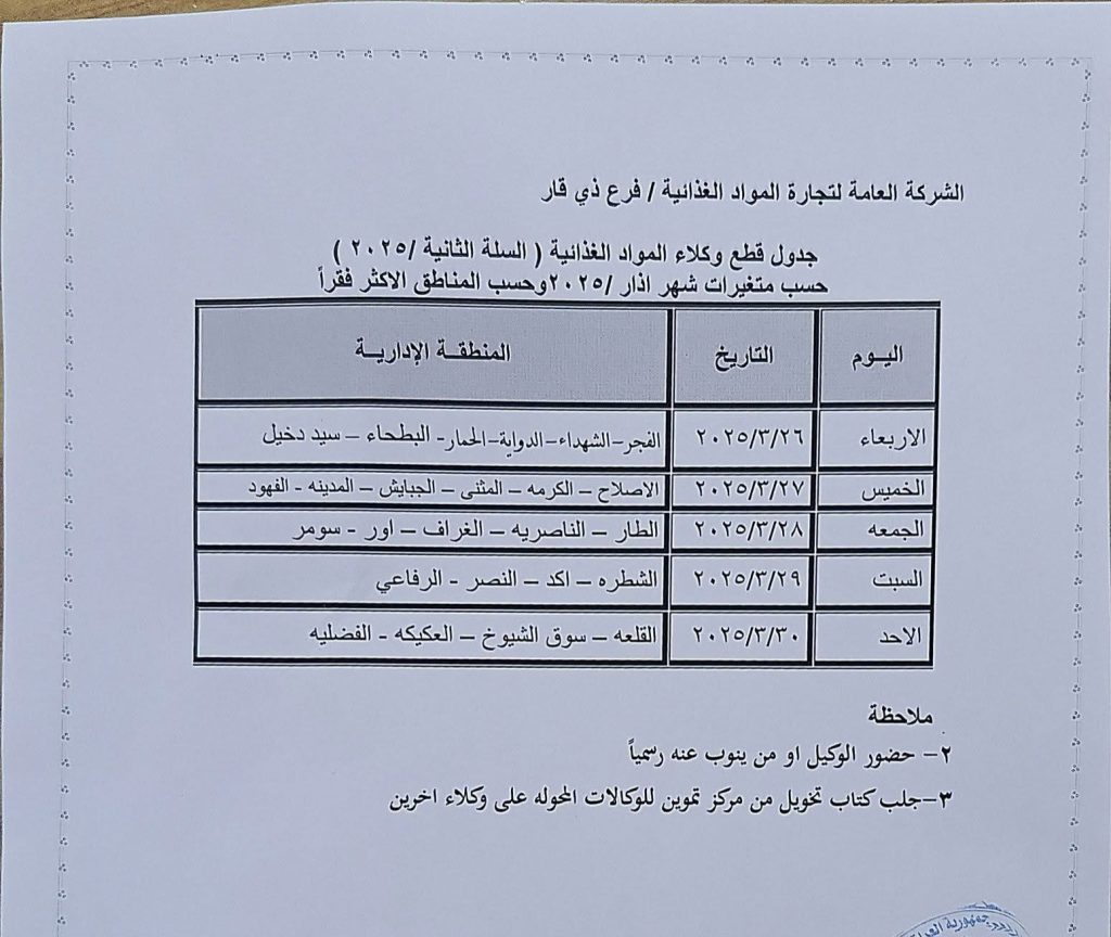 أعلنت الشركة العامة للمواد الغذائية عن قطع وتجهيز مفردات السلة الغذائية الثانية لعام ٢٠٢٥ داعية الوكلاء إلى المراجعة وقطع الحصص وحسب الجدول المرفق.