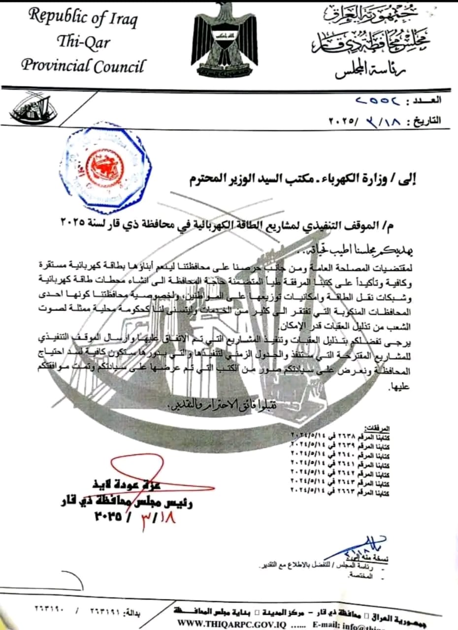 بالوثيقة… ذي قار تخاطب وزارة الكهرباء حول إنشاء محطات الطاقة وشبكات نقل الطاقة