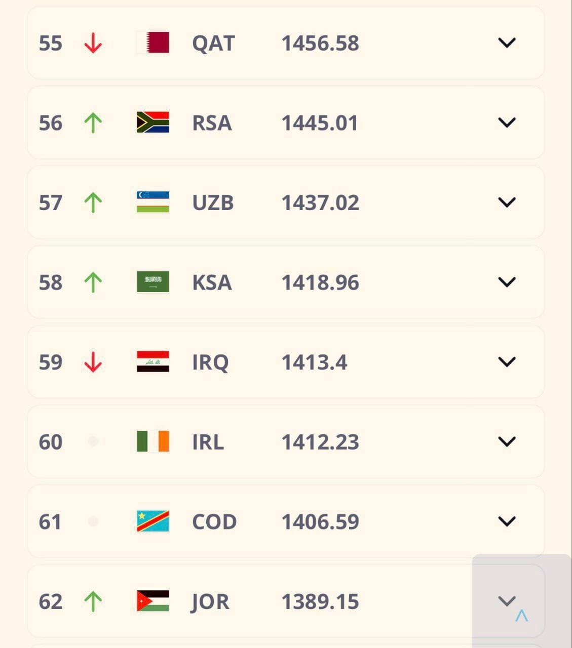 وشهد التصنيف الجديد خسارة المنتخب العراقي 29.46 نقطة، ليصبح أكثر منتخب فقد نقاطًا بين جميع المنتخبات الـ 210 المدرجة في التصنيف.