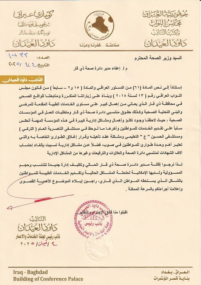 نائب يقدم طلبا رسميا الى وزير الصحة لإقالة مدير عام صحة ذي قار