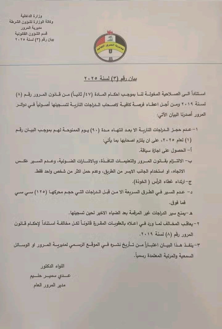 بعد بيان “رقم 1″… المرور العامة تصدر تعليمات جديدة بشأن تسجيل الدراجات النارية