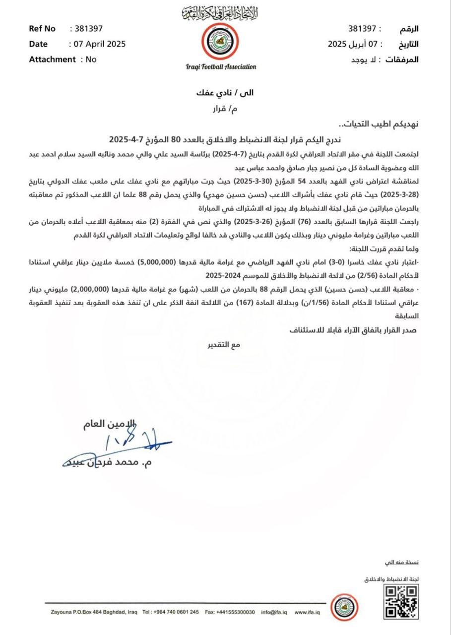 قررت لجنة الانضباط في اتحاد الكرة العراقي اعتبار نادي عفك خاسراً أمام فريق الفهد بنتيجة 3-0 ضمن منافسات الدوري العراقي الممتاز لكرة القدم.