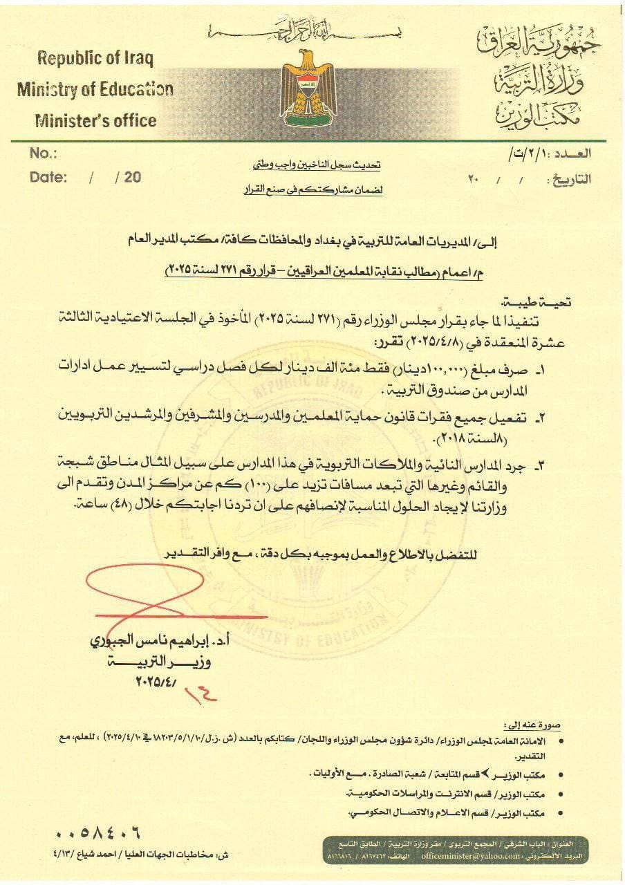 وجه وزير التربية بتنفيذ مطالب نقابة المعلمين العراقيين المصادق عليها في جلسة مجلس الوزراء والتي تقضي بصرف مبلغ 100 الف دينار لكل فصل دراسي للإدارات المدرسية وتفعيل فقرات قانون حماية الملاكات التربوية كافة مع جرد المدارس النائية البعيدة في خطوة هادفة لإنصاف المعلم والمدرس.