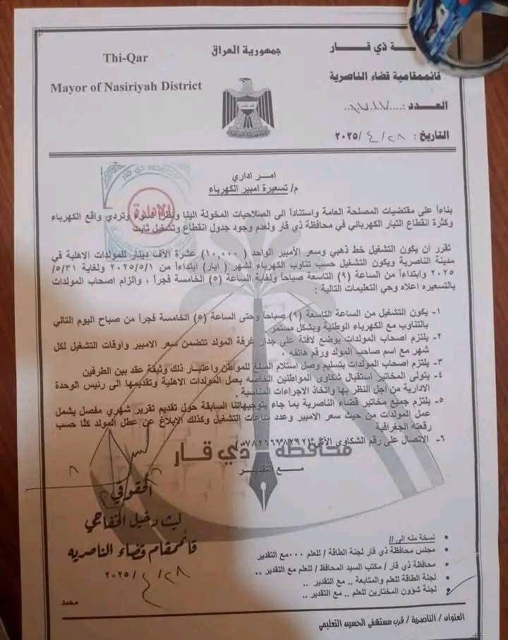 حددت بلدية الناصرية أجور سعر الأمبير المولدات الأهلية ب10 آلاف دينار.