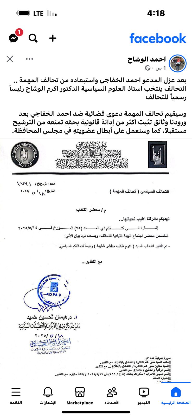 وقال الوشاح في منشور اطلعت عليه صحيفة الناصرية الإلكترونية انه بعد عزل أحمد الخفاجي واستبعاده من تحالف المهمة انتخب أكرم الوشاح رئيسا له.