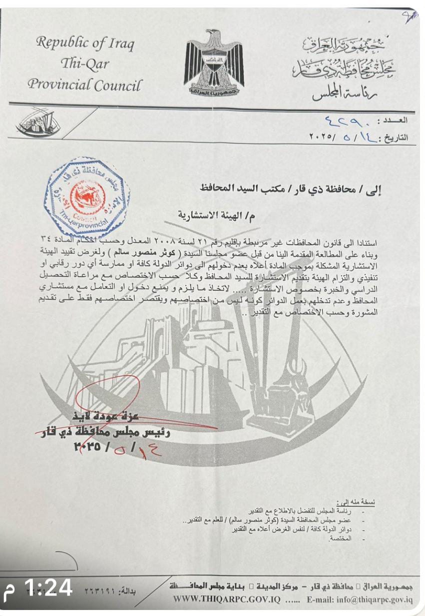 أصدر مجلس محافظة ذي قار توجيهاً رسمياً يقضي بحصر مهام مستشاري المحافظ ضمن الجانب الاستشاري فقط، وذلك وفقاً لاختصاصاتهم وتحصيلهم الدراسي، ومنع تدخلهم في شؤون الدوائر الحكومية أو المهام الرقابية.