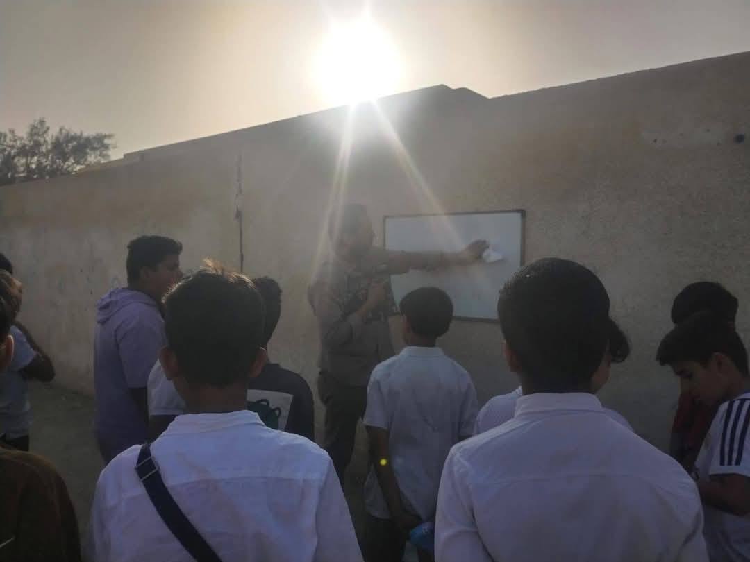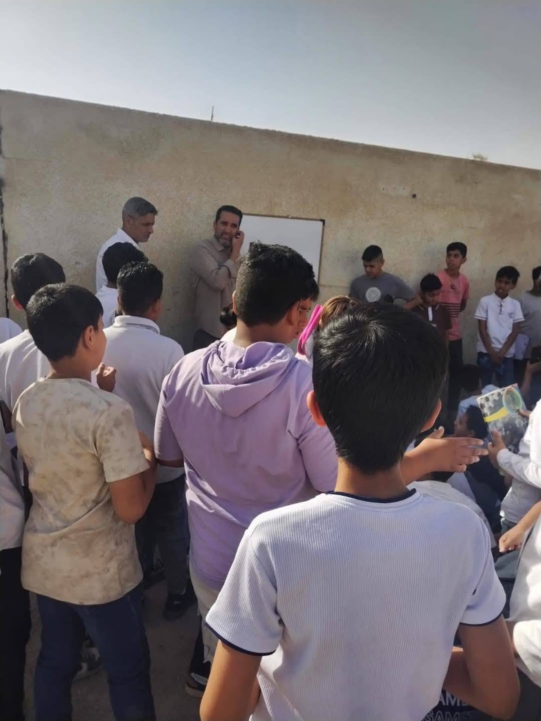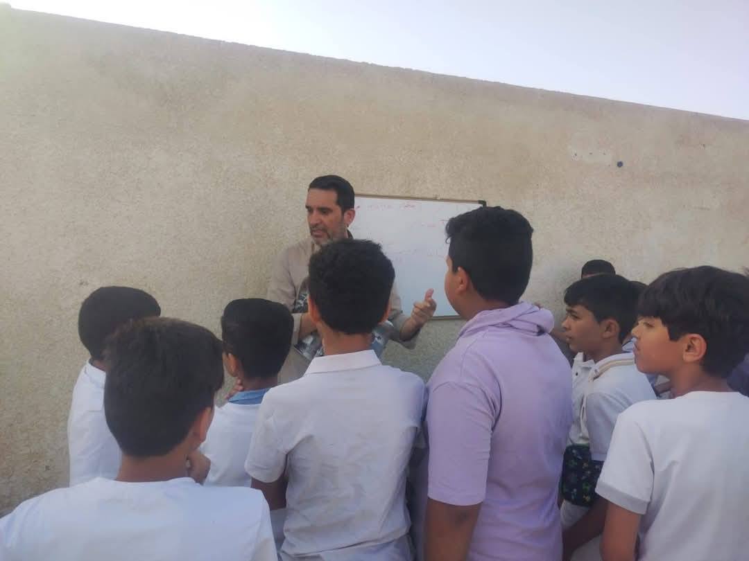 في صورة تعكس حجم الاهتمام، أصر هذا المعلم على جلب سبورته ووضعه على جدران المركز الامتحاني ليشرح للطلاب مادة الدرس التي يستعد لخوضها الطلبة في بداية الامتحانات النهائيةلطلبة السادس الابتدائي.