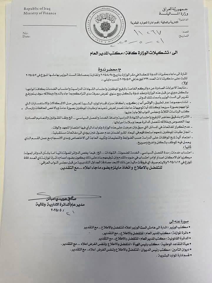 وبحسب وثيقة صادرة عن الوزارة، تلقتها صحيفة الناصرية الالكترونية، وافقت وزيرة المالية على مقررات ندوة عقدت مؤخراً، تضمنت نقاطاً رئيسة أبرزها: