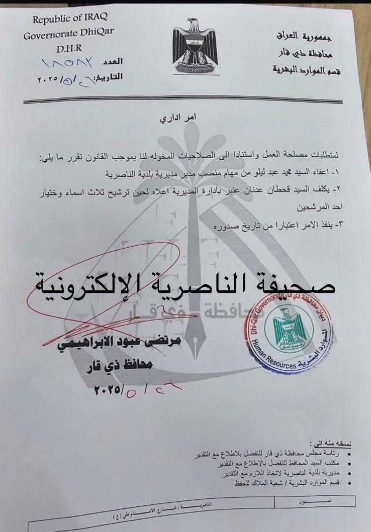 أخبار الناصرية بالوثيقة… محافظ ذي قار يعفي مدير بلدية الناصرية من منصبه في 26/05/2025 صحيفة الناصرية الإلكترونية: اعفى محافظ ذي قار مرتضى الإبراهيمي اليوم الاثنين مدير بلدية الناصرية محمد ليلو من منصبه وتكليف قحطان عدنان بدلا عنه. شارك هذا الموضوع: النقر للمشاركة على X (فتح في نافذة جديدة) X انقر للمشاركة على فيسبوك (فتح في نافذة جديدة) فيس بوك مرتبط أكمل القراءة