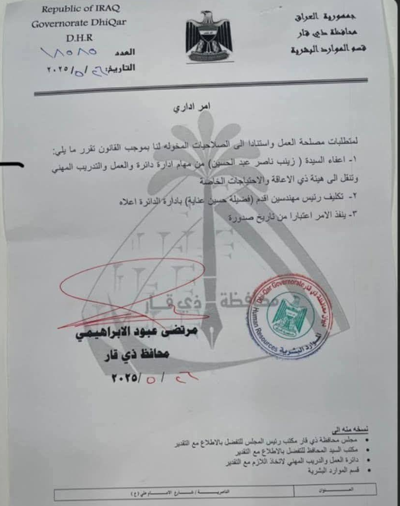 وبحسب وثيقة رسمية صادرة من مكتب المحافظ، تلقتها صحيفة الناصرية الإلكترونية، انه تم تكليف المهندسة فضيلة حسين عناية، وهي رئيس مهندسين أقدم، بتولي مهام إدارة الدائرة خلفًا لعبد الحسين.