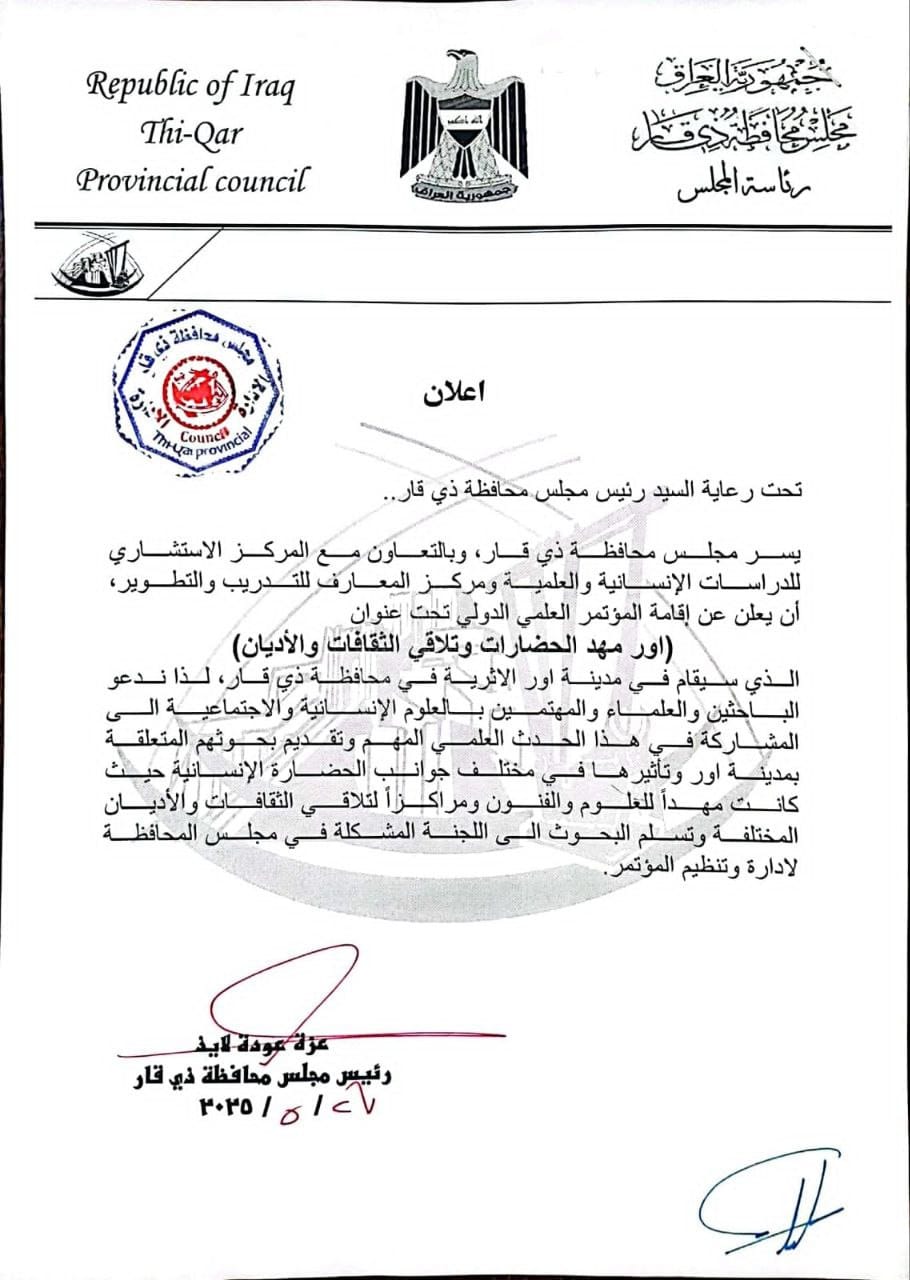 أعلن رئيس مجلس محافظة ذي قار عزة عودة الناشي، عن الاستعداد لإقامة المؤتمر العلمي الدولي تحت عنوان (اور مهد الحضارات وتلاقي الثقافات والاديان) وذلك بالتعاون مع المركز الاستشاري للدراسات الإنسانية والعلمية ومركز المعارف للتدريب والتطوير في مدينة أور الأثرية بمحافظة ذي قار.
