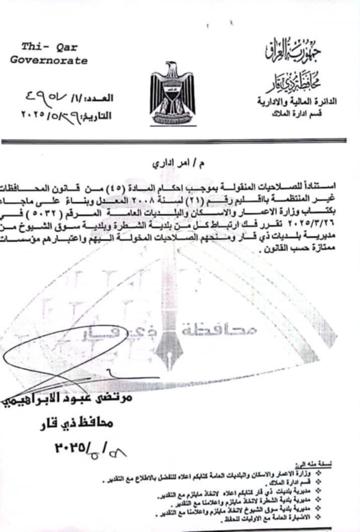 أخبار الناصرية بالوثيقة… فك ارتباط بلديتي الشطرة وسوق الشيوخ عن بلديات ذي قار في 29/05/2025 صحيفة الناصرية الإلكترونية: أصدرت محافظة ذي قار اليوم الخميس أمرا إداريا بفك كل من بلديتي الشطرة وسوق الشيوخ عن بلديات ذي قار بعد تحويل تصنيفهما إلى الدرجة الممتازة. شارك هذا الموضوع: النقر للمشاركة على X (فتح في نافذة جديدة) X انقر للمشاركة على فيسبوك (فتح في نافذة جديدة) فيس بوك مرتبط أكمل القراءة