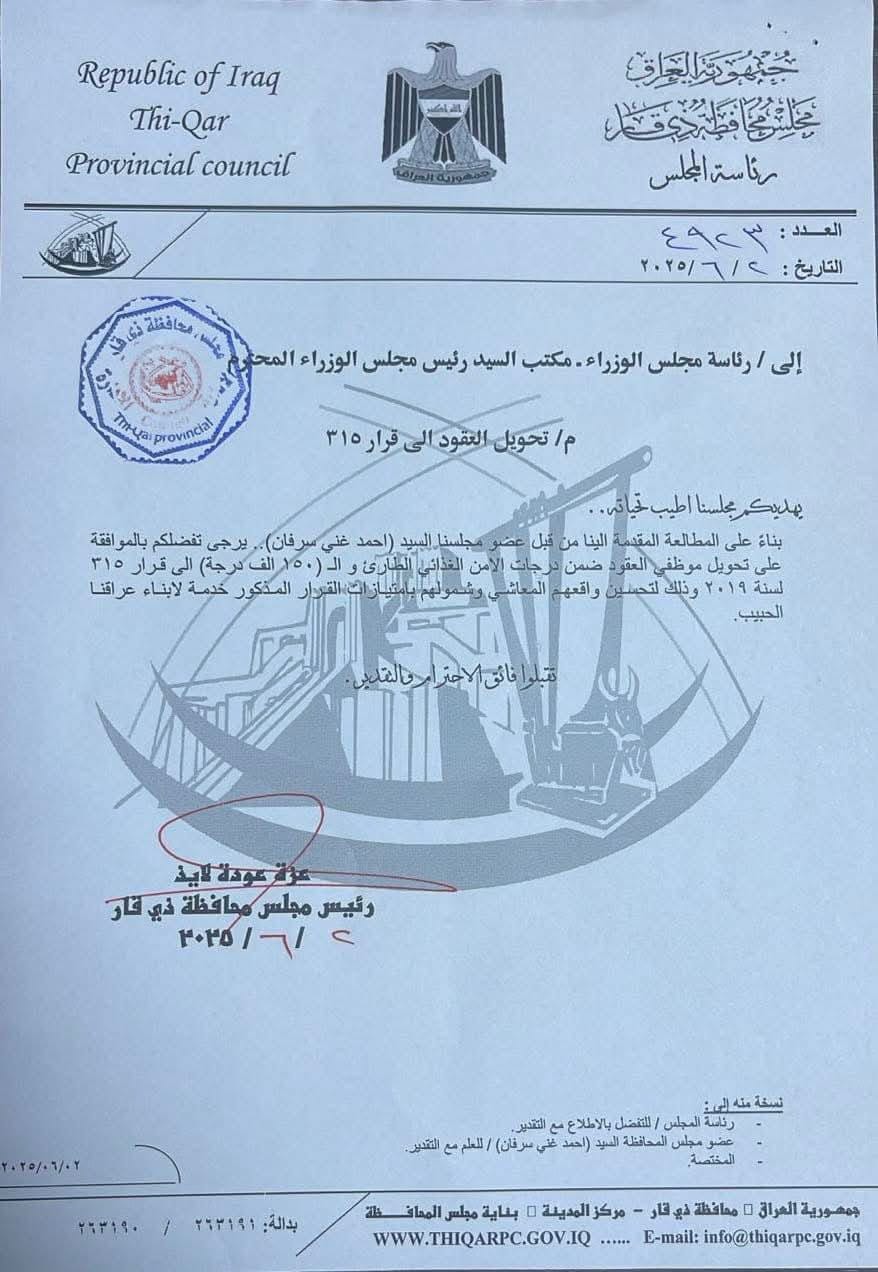 وجّه مجلس محافظة ذي قار كتابا رسميا إلى رئاسة مجلس الوزراء، طالب فيه بالموافقة على تحويل موظفي العقود العاملين ضمن مشروع تشغيل الشباب لعام 2015 (الفئة الدرجة) إلى قرار مجلس الوزراء رقم 315 لسنة 2019، أسوة بأقرانهم في الدوائر الحكومية الأخرى.