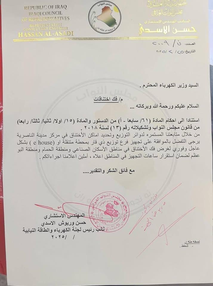 استحصل نائب رئيس لجنة الكهرباء والطاقة النيابية النائب المهندس الاستشاري حسن الاسدي يستحصل موافقة وزير الكهرباء على تجهيز فرع توزيع كهرباء ذي قار