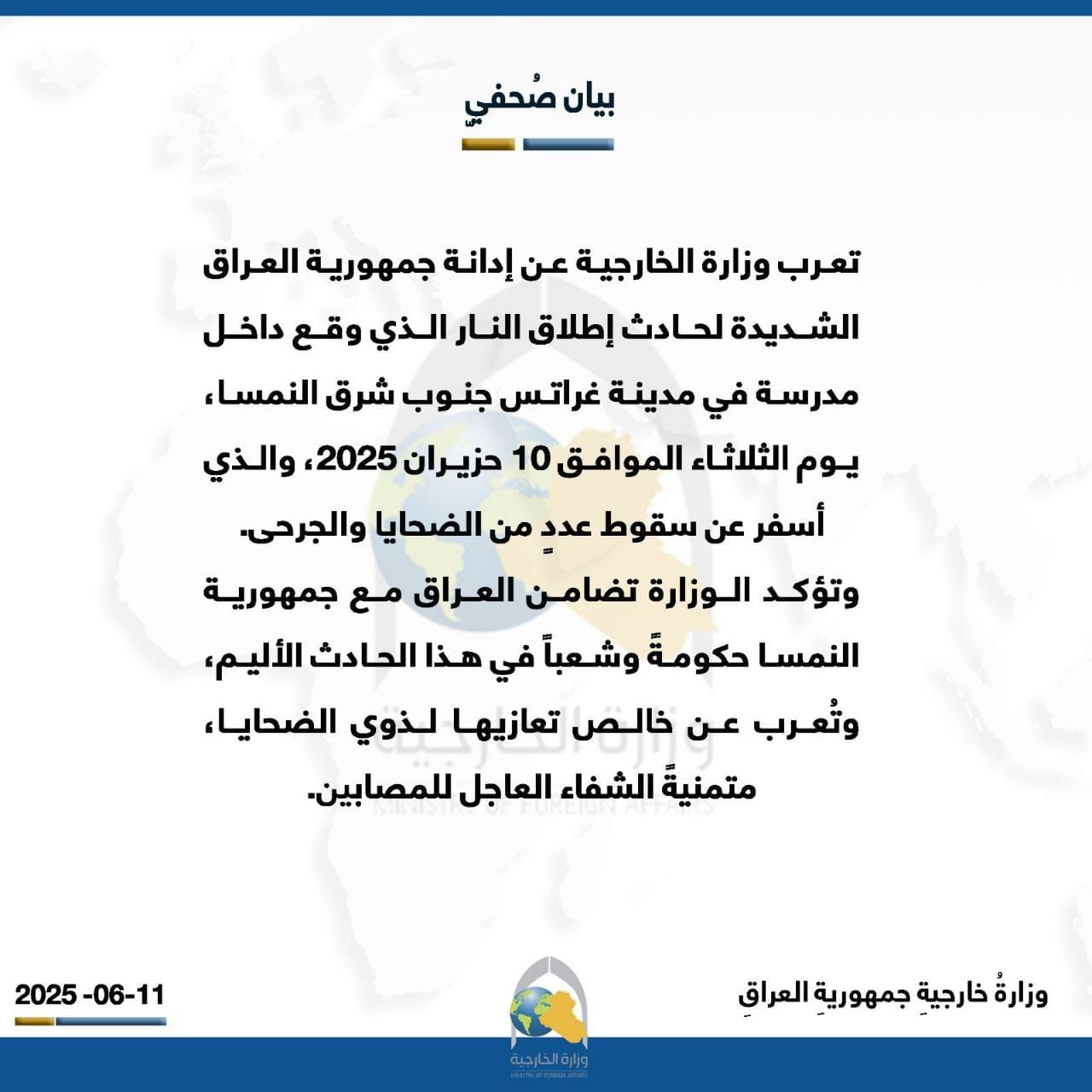 أعربت وزارة الخارجية، اليوم الثلاثاء، عن إدانة جمهورية العراق الشديدة لحادث إطلاق النار الذي وقع داخل إحدى المدارس في مدينة غراتس، جنوب شرق النمسا، في العاشر من حزيران 2025، والذي أسفر عن سقوط عدد من الضحايا والجرحى.