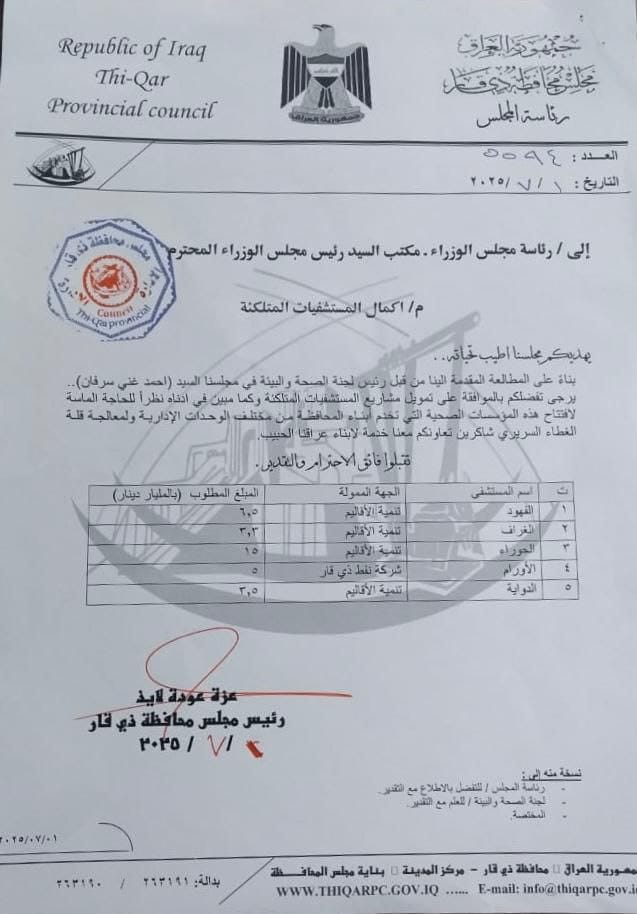 مجلس ذي قار يخاطب رئيس الوزراء لإطلاق تخصيصات المستشفيات المتلكئة