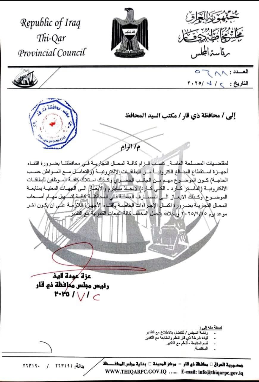 أخبار الناصرية مجلس ذي قار يُلزم المحال التجارية والمطاعم بتفعيل خدمة الدفع الإلكتروني في 10/07/2025 صحيفة الناصرية الالكترونية: اصدر مجلس ذي قار قرارا يلزم فيه المحال التجارية والمطاعم بتفعيل الدفع الالكتروني. شارك هذا الموضوع: النقر للمشاركة على X (فتح في نافذة جديدة) X انقر للمشاركة على فيسبوك (فتح في نافذة جديدة) فيس بوك مرتبط أكمل القراءة