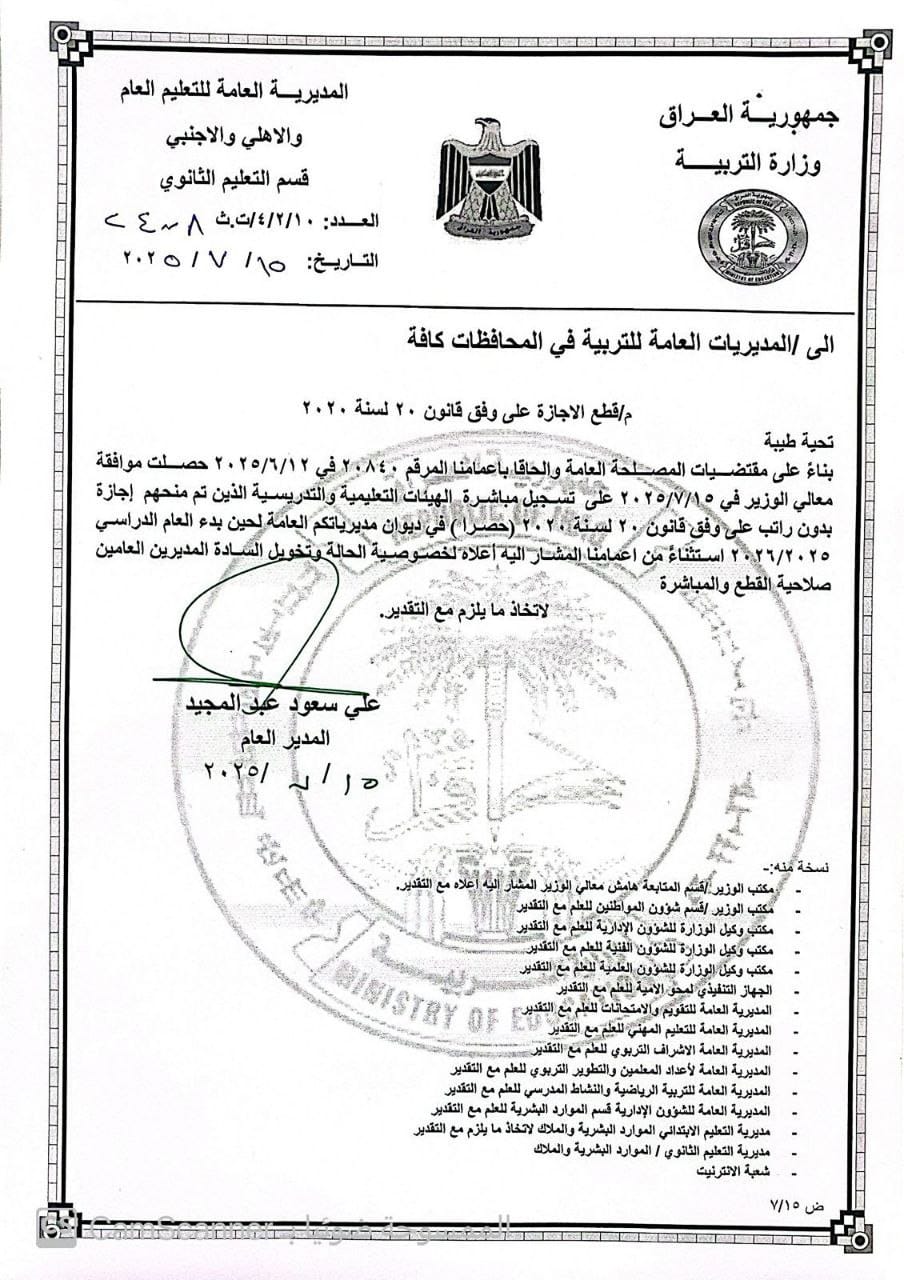 قررت وزارة التربية / المديرية العامة للتعليم العام والأهلي والأجنبي، تسجيل مباشرة الهيئات التعليمية والتدريسية في مديرياتهم، وذلك لمن تم منحهم إجازة بدون راتب حصراً وفقاً لقانون رقم 20 لسنة 2020.
