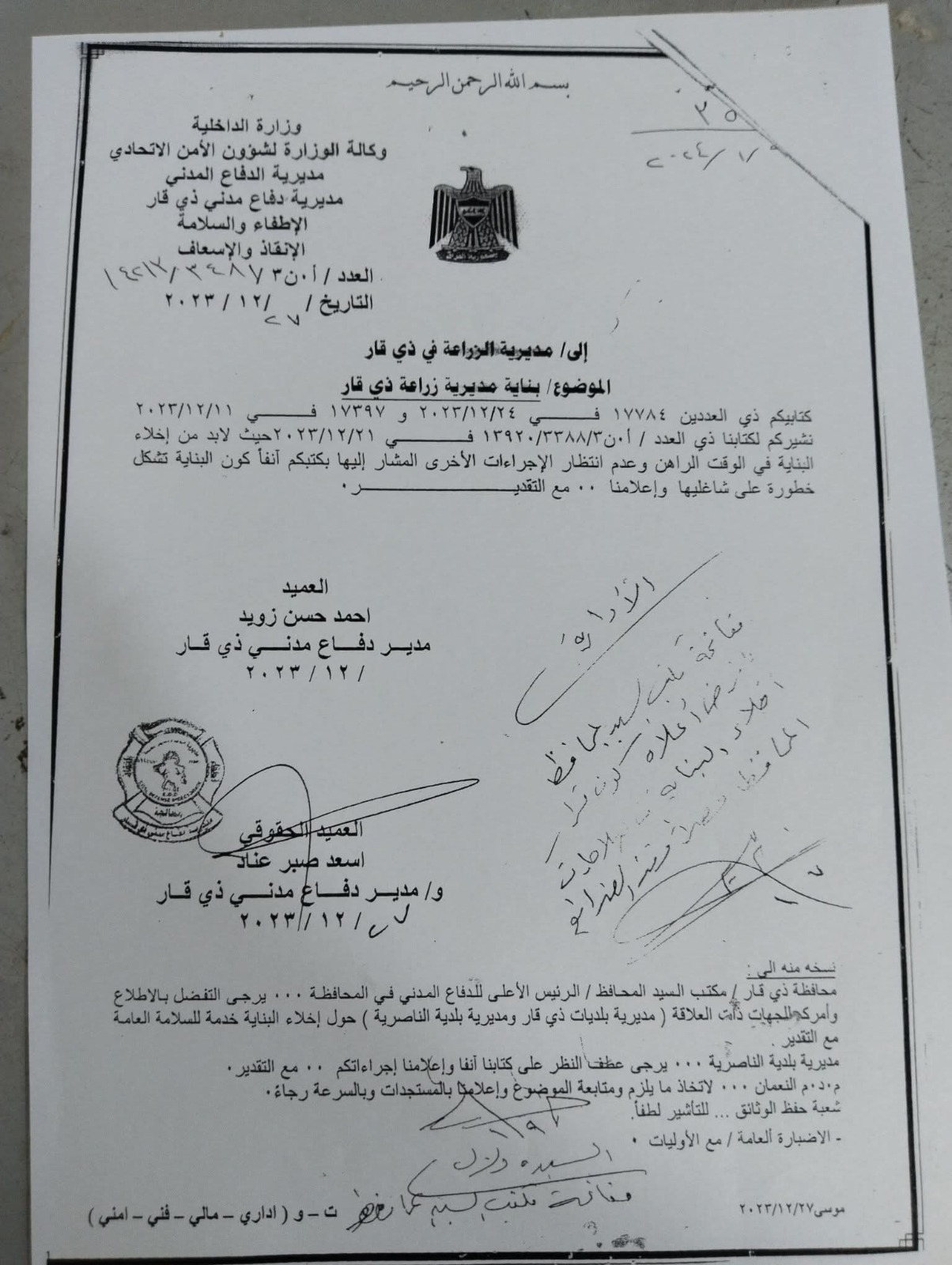 حذر موظفون في مديرية زراعة ذي قار من انهيار مبنى الدائرة الذي يقع في وسط مدينة الناصرية، حيث طالبوا الجهات الحكومية للتدخل واغلاق المبنى.