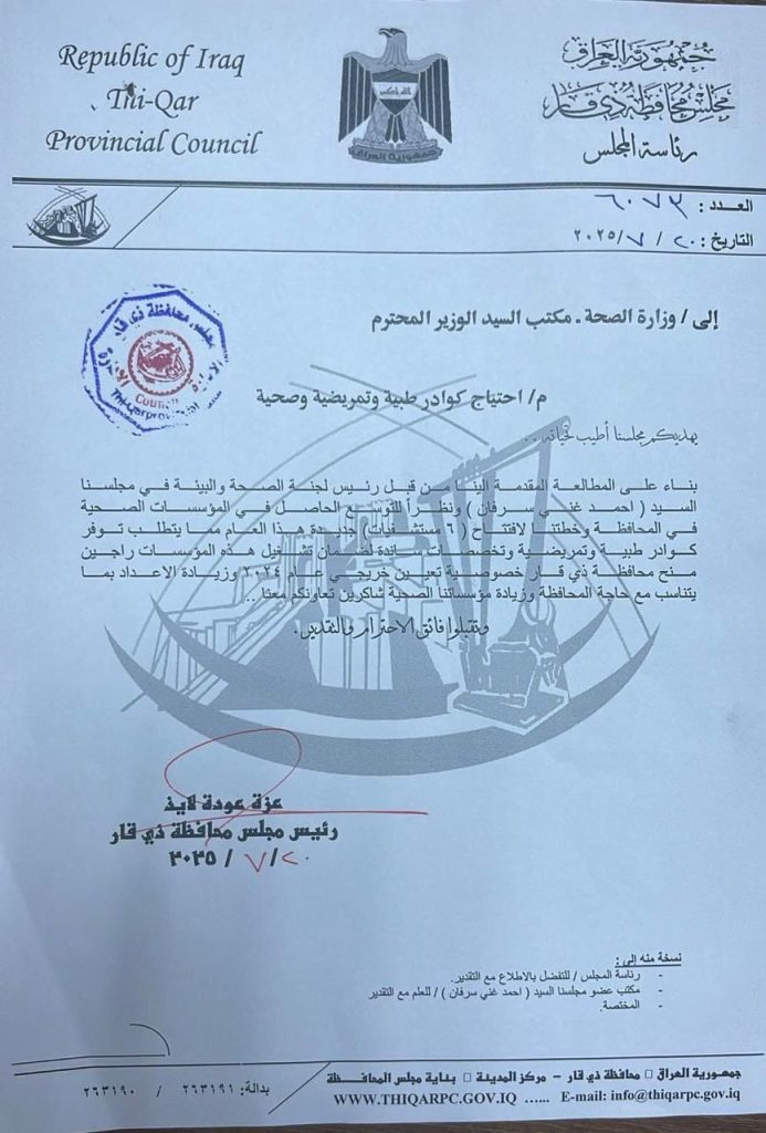 خاطب مجلس ذي قار وزارة الصحة اليوم الأحد بشكل رسمي لرفد المحافظة بملاكات طبية وتمريضية وصحية، وذلك لسد النقص الحاصل وتغطية احتياجات المؤسسات الصحية، خصوصاً مع التوسع المستمر وافتتاح عدد من المراكز والمستشفيات الجديدة في المحافظة.