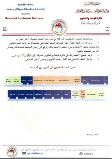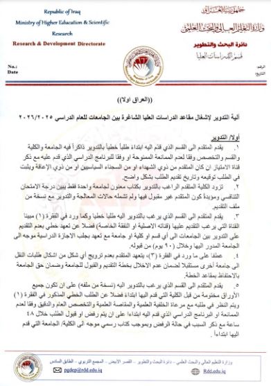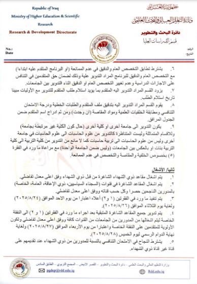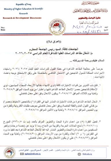 وذكرت الوزارة في بيان، ان “توقيتات التدوير تبدأ اعتبارا من 2025/8/9 وحتى 2025/8/28 لإتمام الإجراءات المتعلقة بإشغال مقاعد الدراسات العليا الشاغرة للناجحين في الامتحان التنافسي على وفق المفاضلة والاستحقاق”.