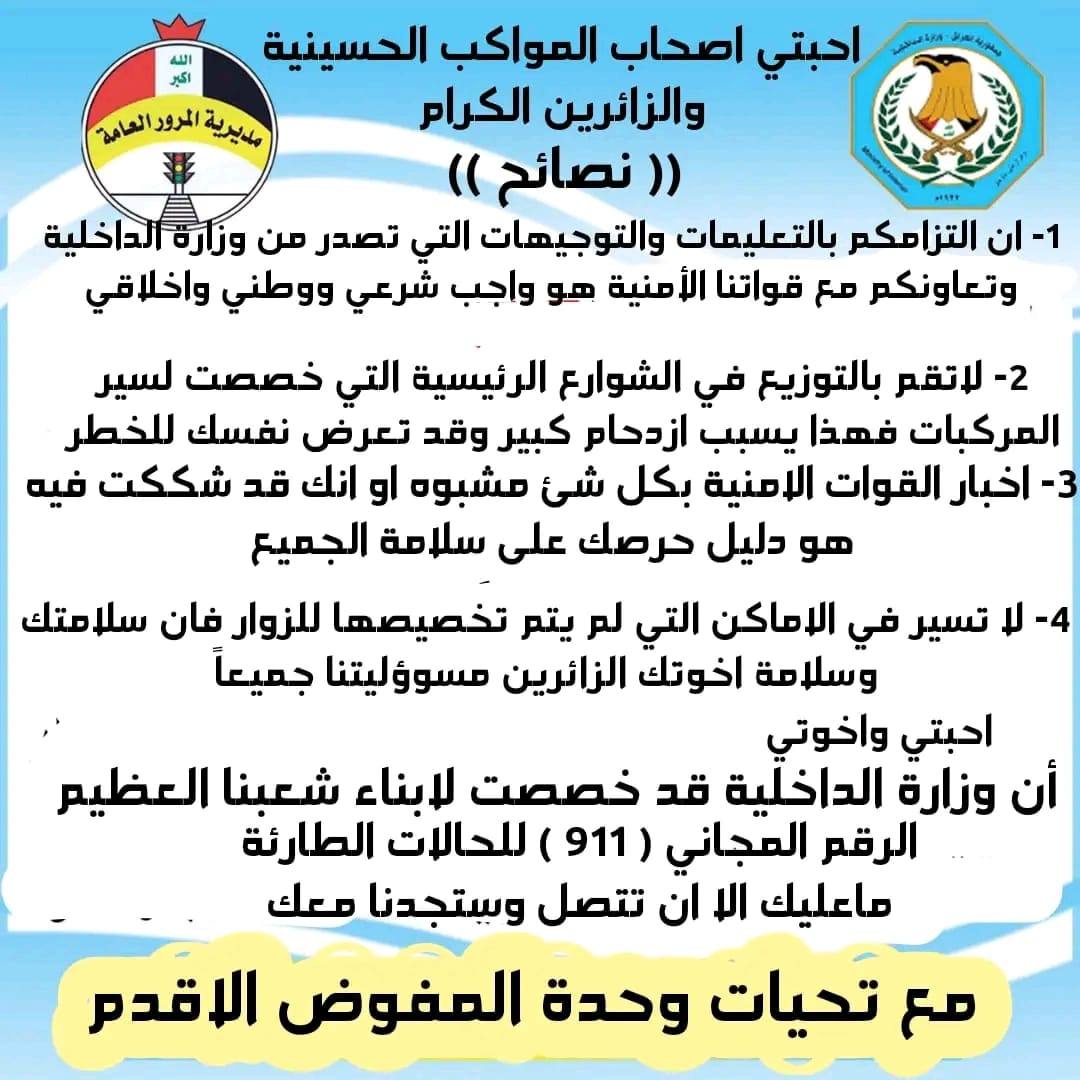 أصدرت مديرية المرور العامة، اليوم الأحد، عدة توصيات إلى أصحاب المواكب الحسينية والزائرين.