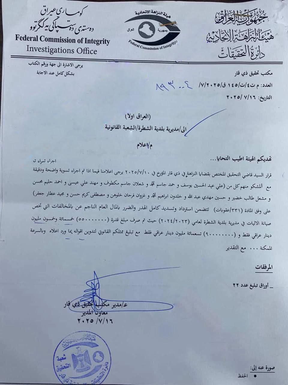 بالوثيقة… النزاهة تكشف عن هدر اكثر من مليار دينار في بلدية الشطرة خلال 2023 و2024
