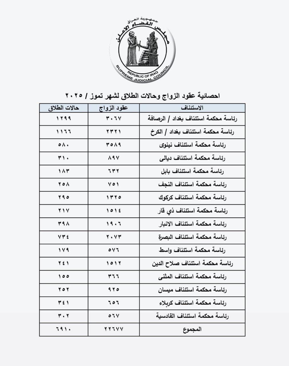 ادناه احصائية الزواج والطلاق في البلاد لشهر تموز الماضي: