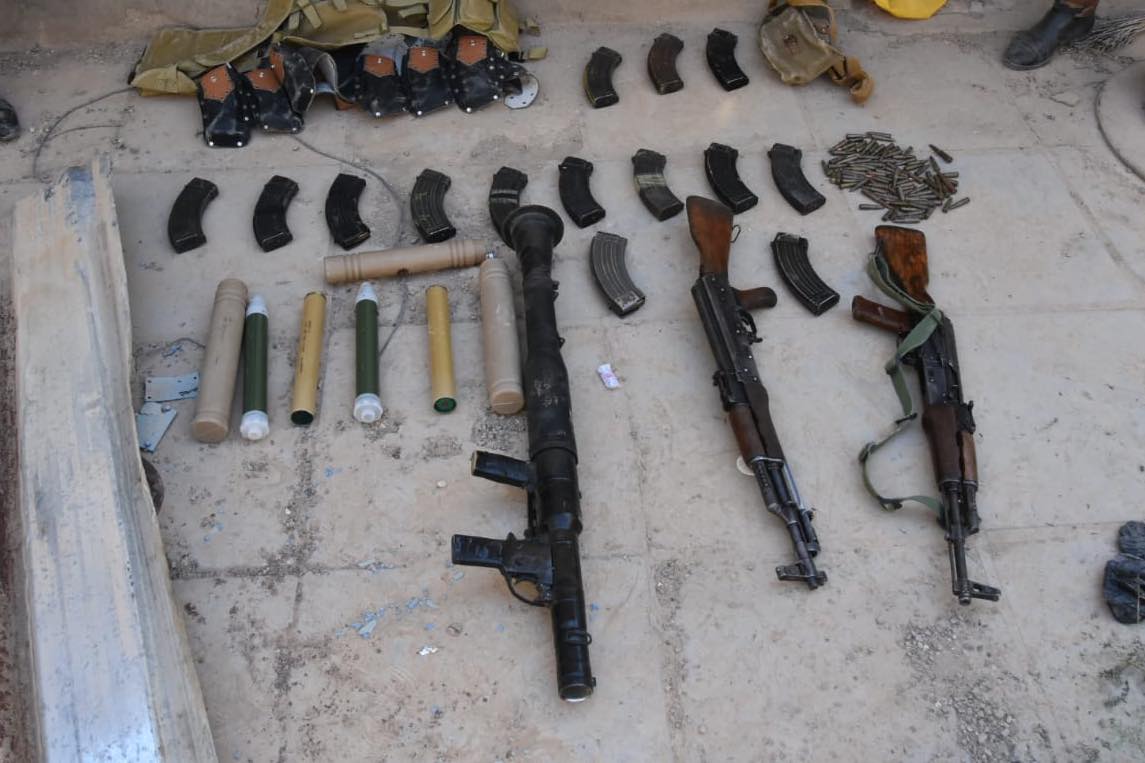 واوضحت القيادة انه تم “ضبط الأسلحة، وتضمنت قاذفة RBG7 عدد /1، صاروخ قاذفة أشخاص عدد/ 2، حشوة قاذفة عدد /2، بنادق كلاشنكوف عدد/ 2، مخازن كلاشنكوف عدد 14 أحدها فارغ، مشالح عتاد عدد/ 4