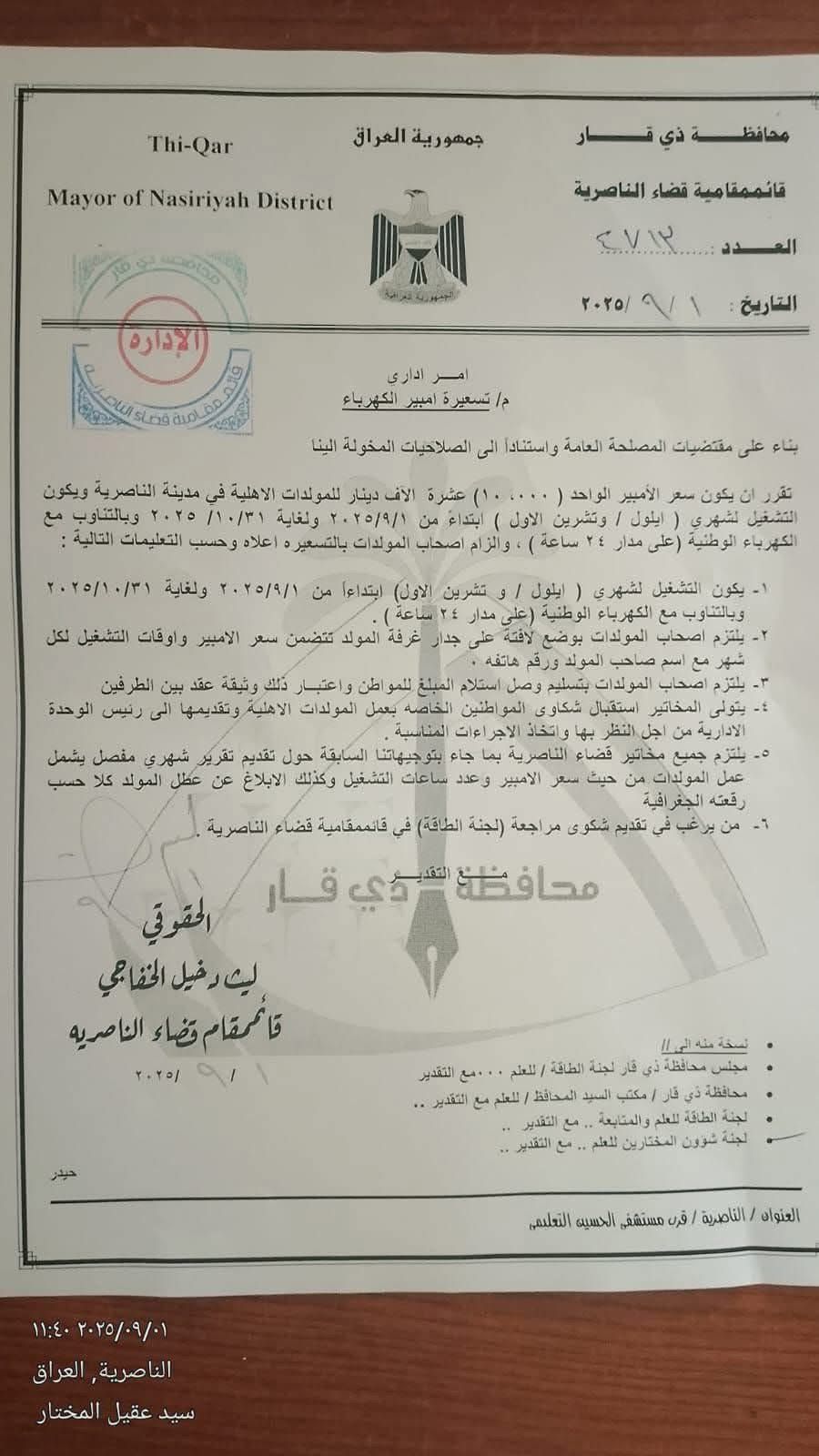 قضاء الناصرية يحدد سعر الأمبير وساعات تشغيل لشهرين فقط