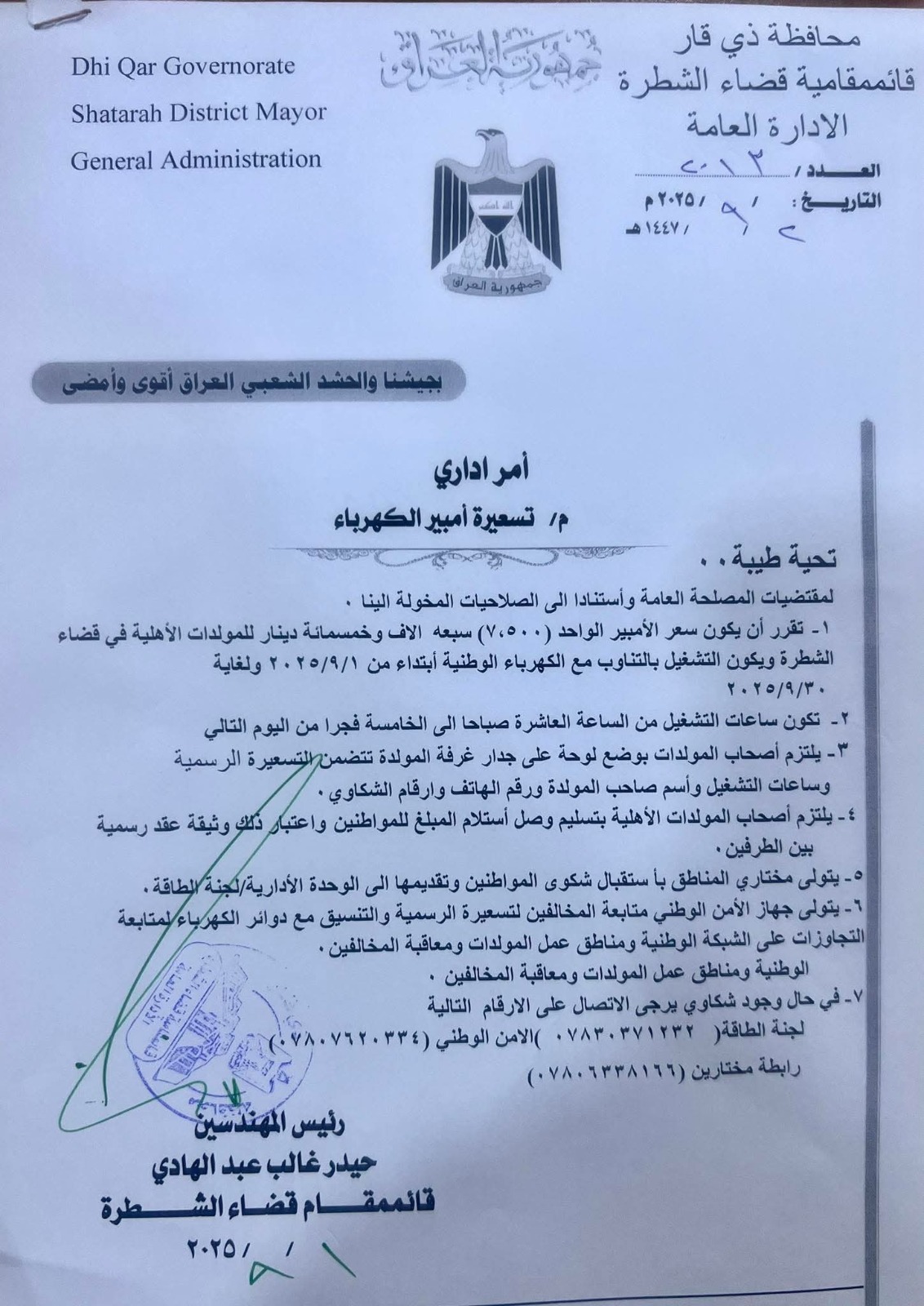 أخبار الناصرية الشطرة تحدد سعر الامبير وساعات التشغيل في 03/09/2025 صحيفة الناصرية الالكترونية: حددت الحكومة المحلية في قضاء الشطرة ساعات التشغيل واسعار امبير للمولدات الاهلية والتي ستكون لشهر ايلول فقط. شارك هذا الموضوع: النقر للمشاركة على X (فتح في نافذة جديدة) X انقر للمشاركة على فيسبوك (فتح في نافذة جديدة) فيس بوك مرتبط أكمل القراءة