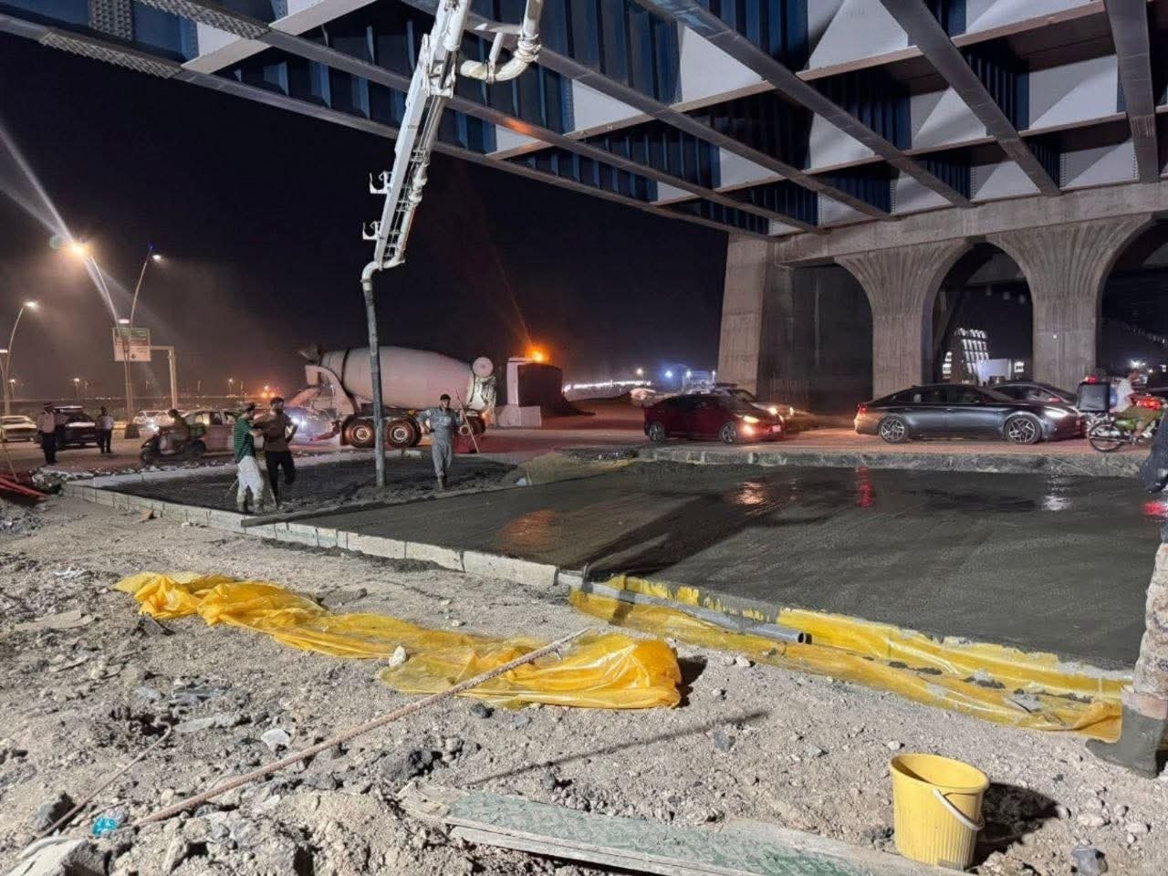 باشرت الكوارد الفنية في الشركة المنفذة لمشروع جسر الزيتون المعلق في اعمال صب المقتربات في ساعات الفجر الاولى.